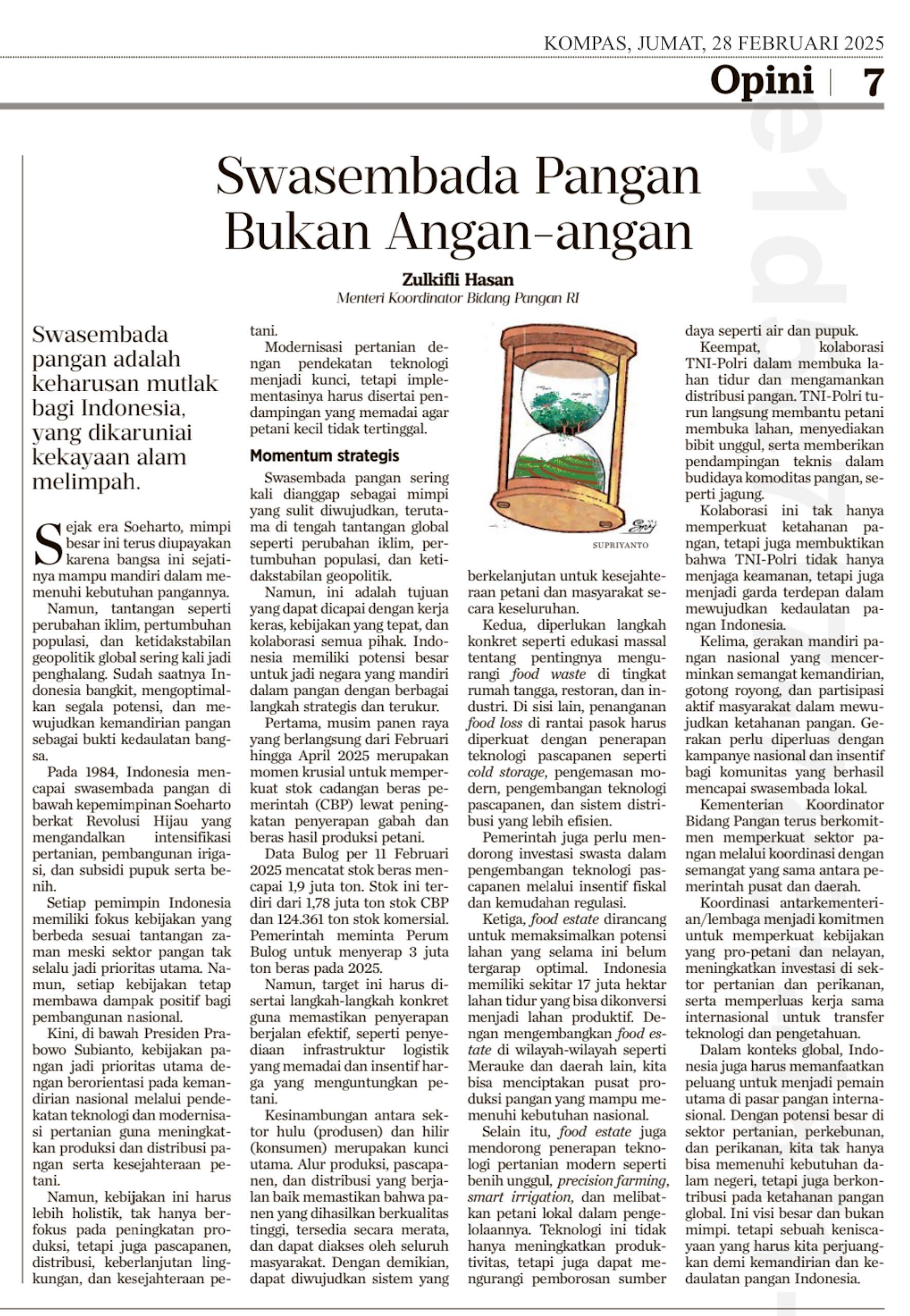Dalam konteks global, Indonesia juga harus memanfaatkan peluang untuk menjadi pemain utama di pasar pangan internasional. Dengan potensi besar di sektor pertanian, perkebunan, dan perikanan, kita tak hanya bisa memenuhi kebutuhan dalam negeri, tetapi juga berkontribusi pada ketahanan pangan global. Ini visi besar dan bukan mimpi, tetapi sebuah keniscayaan yang harus kita perjuangkan demi kemandirian dan kedaulatan pangan Indonesia. -ZH-